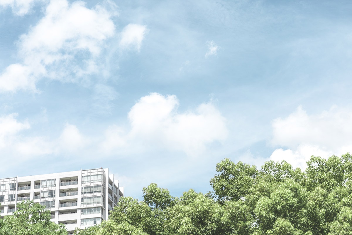 四季折々に表情を変える大きな公園のある落ち着いた街並みの中にあります。